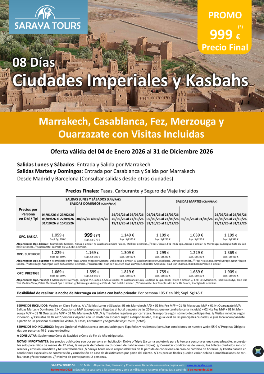 Promo !! Ciudades Imperiales y Kasbahs 8 días. Visitas Incluidas: Rak, Cmn, Fez, Erfud, Ouarzazate hasta Dic26