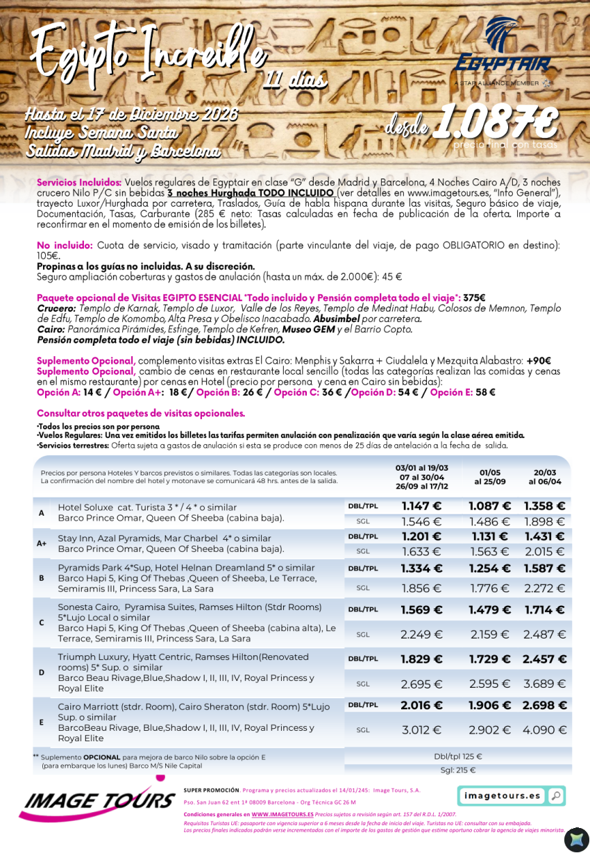 Egipto Increíble hasta dic. 2026, 11 días con Cairo AD, Crucero Nilo PC y Hurghada Todo Incluido. Desde 1087€